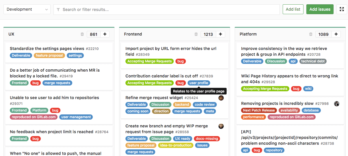The GitLab Issue Tracker is an advanced and complete tool for tracking the evolution of a new idea or the process of solving a problem.